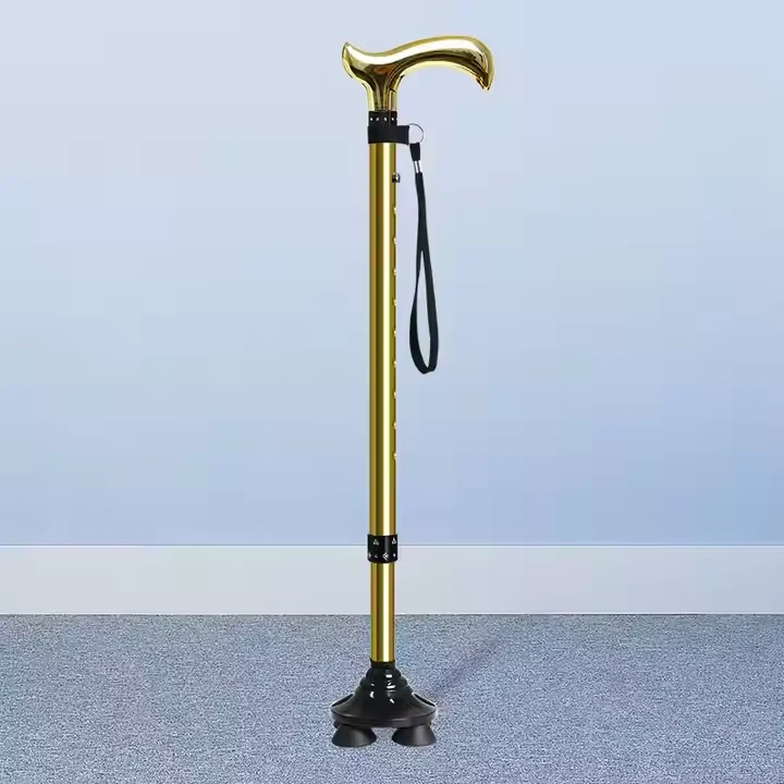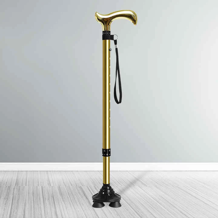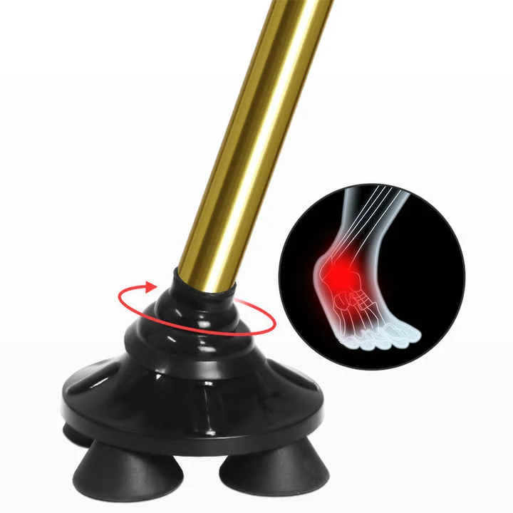 Polo de camiñada telescópica de aliaxe, a base Quad convérteo nunha cana de si mesmo que elimina a caída ou a caída no chan. Unha vez tensado, a cana funciona como un sólido pau ríxido.
