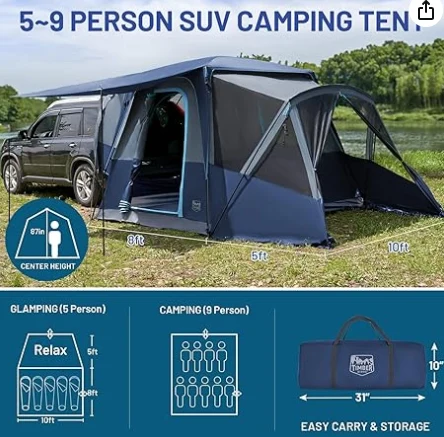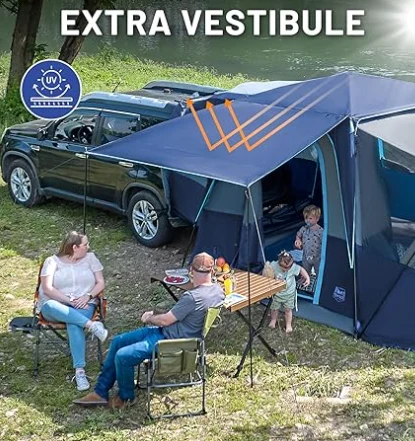 Camping Family Trip Tent Tent, a gran carpa SUV inclúe un soportal e un toldo de 6 x 8 ft para obter máis comodidade e organización; Perfecto para almacenar zapatos, refrixeradores e cadeiras mentres mantén o espazo ordenado