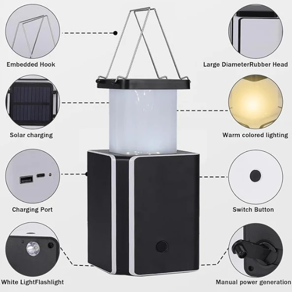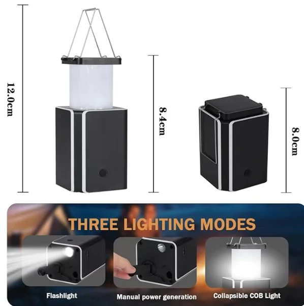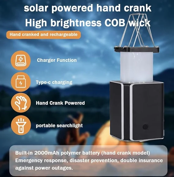 Luz de acampada solar LED, xeración de enerxía de lanternas de lanterna de lanterna de emerxencia. Se non tes un cargador e non hai sol, este xerador de manivela é perfecto para cargar luz.