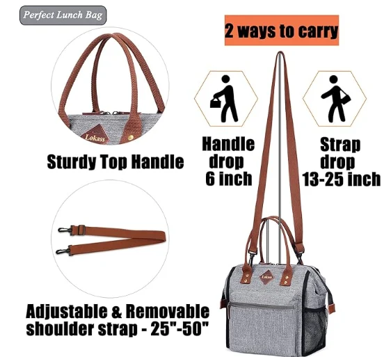 A bolsa de xantar grande ten un compartimento principal (10,5 "x6" x12 "), un gran peto de cremalleira dianteira (8" x7 "x1,5"), un peto traseiro (9,5 "x6,5") e 2 petos de malla lateral. Tiróns superiores e correa de ombreiro axustable e extraíble (25 "-50") Deseño para transportar fácilmente.