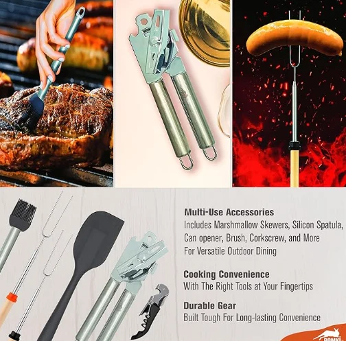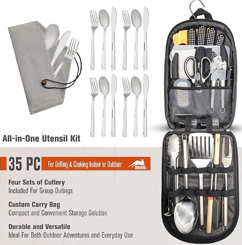 Bolsa de almacenamento de utensilios de cociña ao aire libre Este conxunto de utensilios de cociña de 35 PC é unha solución completa para as súas necesidades de cociña ao aire libre. Inclúe un conxunto de cociña de acampada e un conxunto de utensilios de acampada, todo embalado nunha bolsa personalizada con compartimentos adicionais e dous petos traseiros. O conxunto está deseñado para atender a todos os seus elementos esenciais para cociñar, converténdoo nun complemento indispensable ao seu equipo de acampada