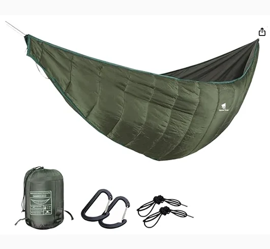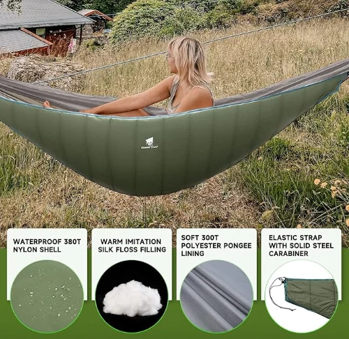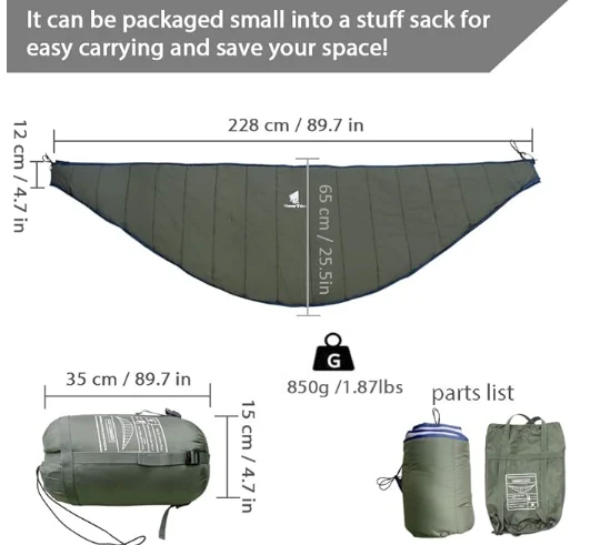 O edredón de hamaca de 3 a 4 tempadas é ideal para temperaturas de 41 ° F a 68 ° F; Ten forma perfectamente para colgar colgando unha hamaca, que te protexe do vento e manténche cocido.